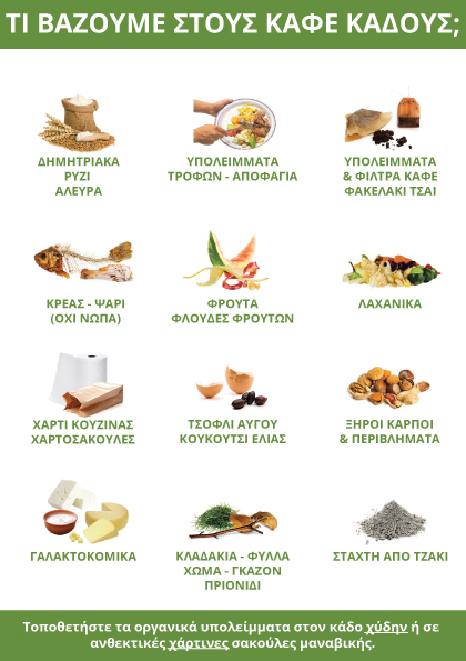 - Η εναπόθεση των οργανικών βιοαποβλήτων στους καφέ κάδους μπορεί να γίνει σε βιοδιασπώμενες σακούλες, χύδην ή/και σε χάρτινες σακούλες.
